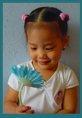 This is one of my daughterβs portrait photo I did years agoβ¦I have lots of these where she is holding different kinds of flowers, real or plastic and in different colors. In this photo is an artificial blue Gerbera. =)